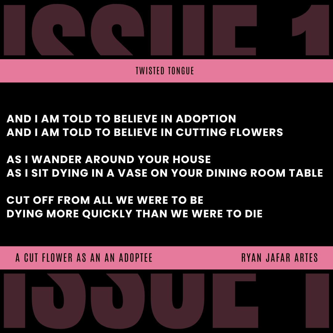 I wrote “A Cut Flower as an Adoptee” after attending Ghosted World: An Uncancelled Asian American Literature Festival in August 2023. Read more about the story behind this poem and the full piece here. Thank you to Brenna Ebner and her team at Twisted Tongue Press for giving such a nicely presented home to my work. <3